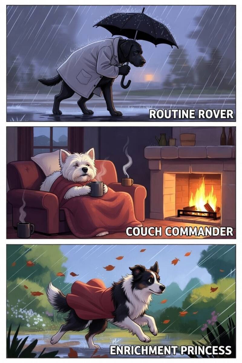 First up is Routine Rover, the dog equivalent of that colleague who insists on the same coffee order every single day at exactly 8:17 a.m. This lad has his sacred three-lap circuit around the block etched into his DNA. Rain? Hail? Nuclear winter? Doesn't matter. He will stand by the door, stare soulfully, and guilt-trip you until you kit up like you're heading to Everest base camp. Today? He got as far as the doorstep, paws planted like he'd grown roots, and gave me the look that said, "You can drag me, but I'll make it theatrical." But still he stepped out and off we went, in the pishing rain. He trotted along like nothing happened, tail wagging, while I resembled a drowned rat who'd lost a fight with a garden hose. Routine must be preserved, even if it means we both need therapy afterwards.